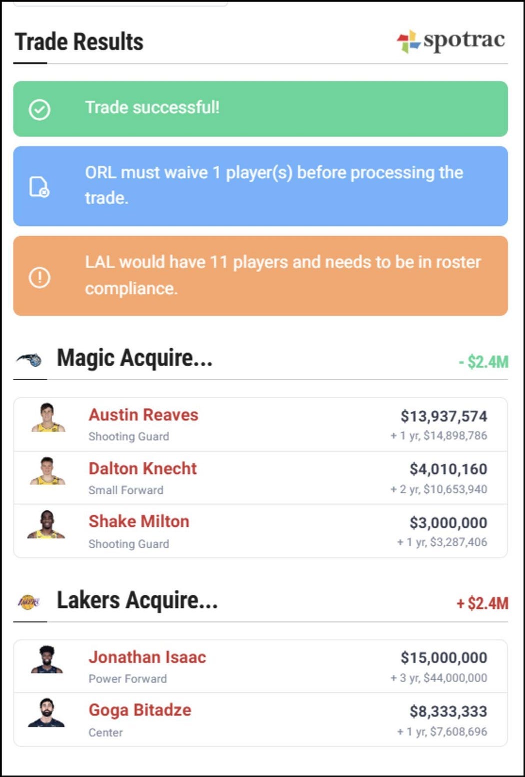 Trade #6: See the Grizz. They hold all the cards in the John Isaac deal. He’s basically a “Get under the Cap Now” card in Monopoly and you’re sending them players they already have an ample amount of that puts them right at the cap (technically just below it, I know, but they won’t have much wiggle room once they trade Isacc unless they want to tweak the core).